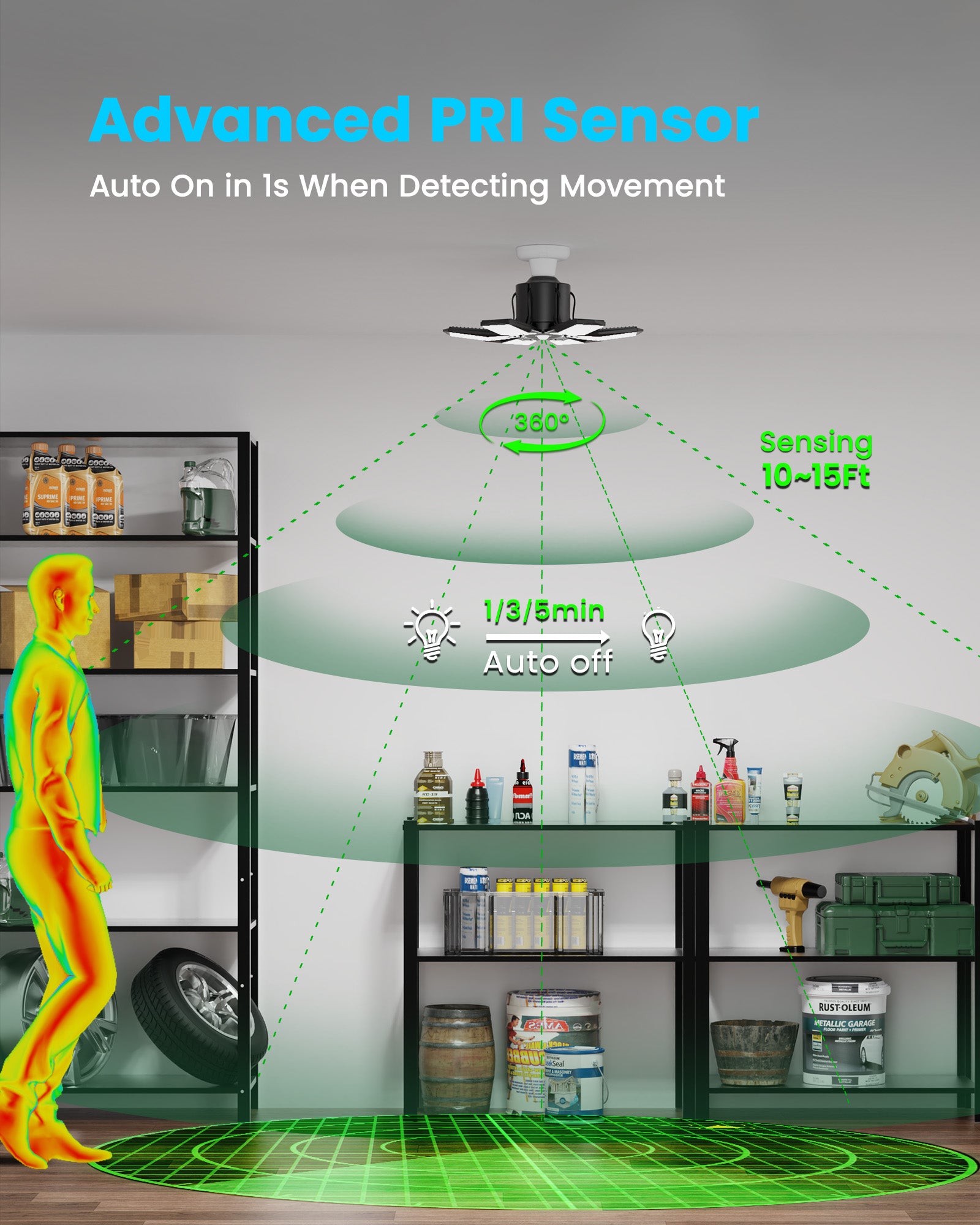 200W Motion Sensor Garage Light (6 Blades, 200 sq.ft Coverage)